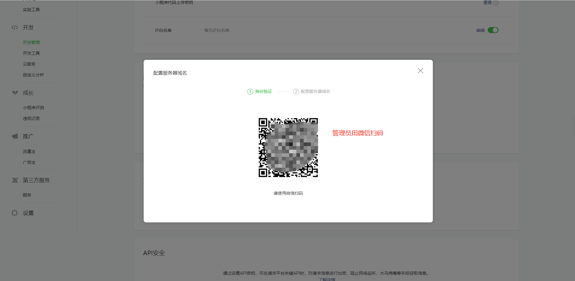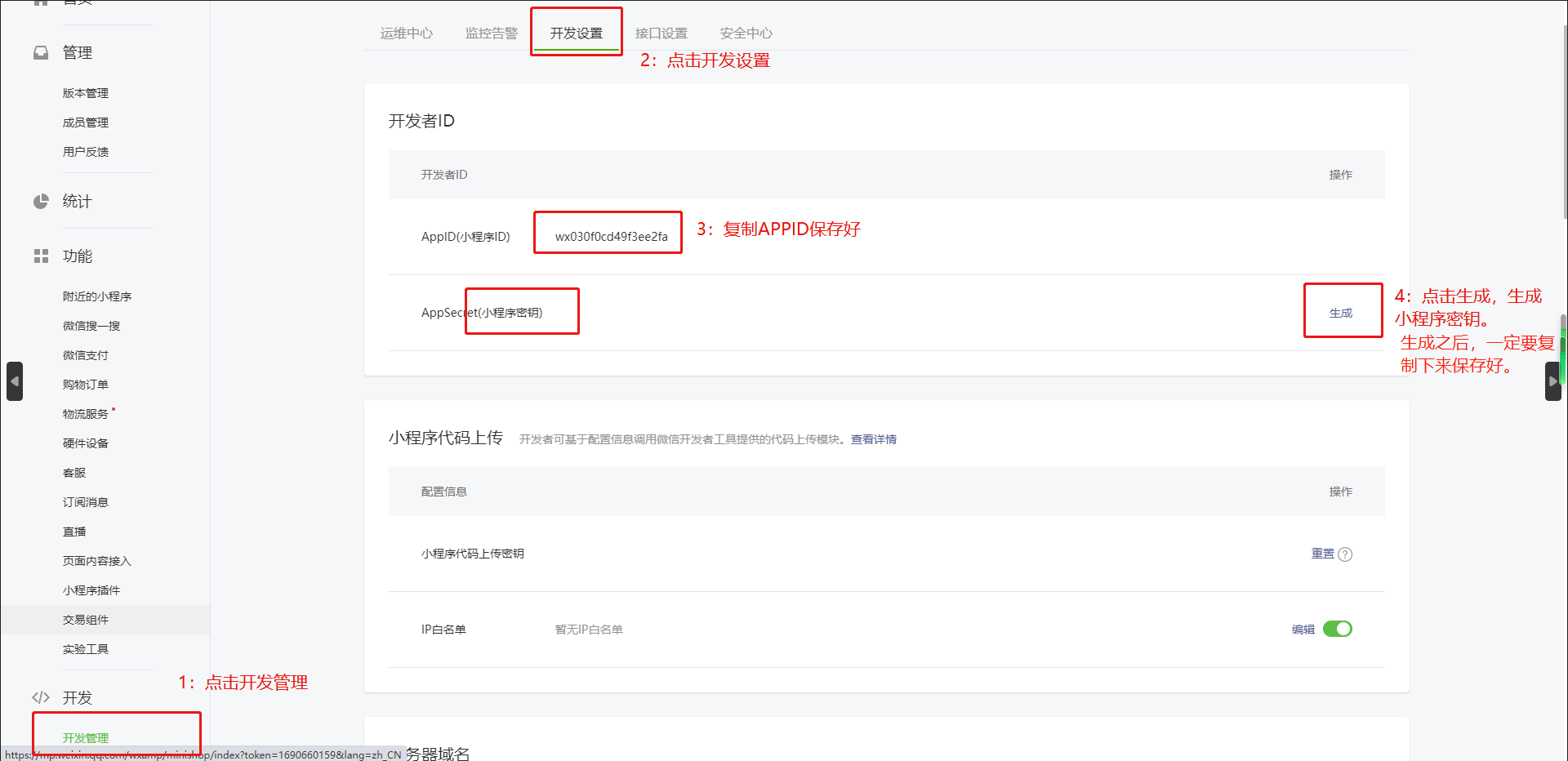 2:点击开发管理-开发设置-设置密钥,并且复制好信息,点击添加IP白名单。