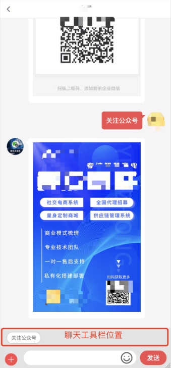 点击聊天工具栏上的关注公众号按钮,即可触发关键词关注公众号,自动回复后台设置的关键词内容(海报图片),引导用户关注公众号。